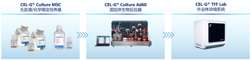 同腾新创自主研发的CEL-G®系列产品—“CEL-G® Culture MSC 无血清/化学限定培养基”、“CEL-G® Culture Ad60固定床生物反应器”、“CEL-G® TFF Lab外泌体浓缩系统”,为外泌体临床转化及应用提供一站式解决方案。该平台采用创新的3D固定化培养技术,通过低剪切力培养环境和多参数的精确调控支持高密度细胞培养,并实现细胞培养与外泌体浓缩的全程智能化控制和自动化操作。目前采用该平台在化学成分限定培养基(即纯CD培养基),产量稳定在1-3E10particles/ml(受培养基和细胞来源略有波动),且工艺相关杂质与其他自动化工艺如机械搅拌式工艺比,低至1/50-1/100,展现了其在规模化生产中的高效性和稳定性。