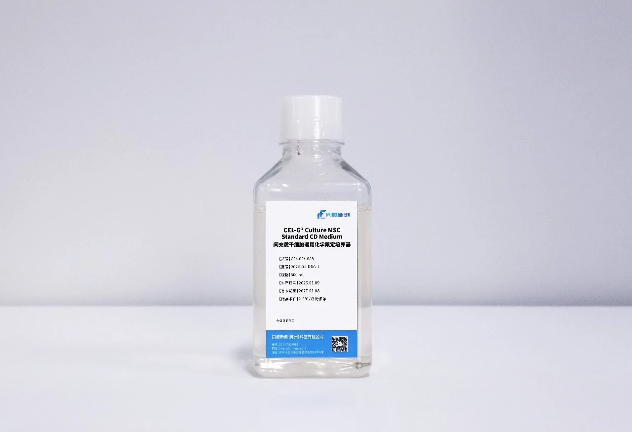 重磅新品加持,直播干货来袭!2026年1月29日,同腾新创(苏州)科技有限公司正式推出间充质干细胞通用化学限定培养基——CEL-G® Culture MSC Standard CD Medium(简称Standard CD培养基,图1,货号:C04.004.008),以专业严谨的态度打造即用型产品,为行业提供合规化解决方案,一经推出便备受关注。