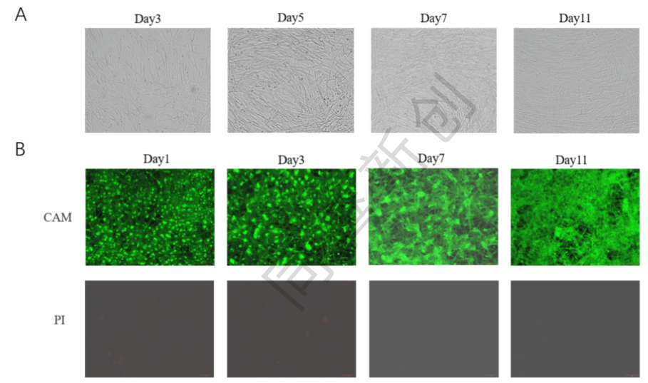 P5代UC-MSC细胞分别接种至培养皿和Ad60 FBR进行2D和3D培养,分别在Day3、5、7、9更换新鲜培养基,培养至11天。培养过程中对培养皿中细胞镜检观察拍照,对Ad60 FBR细胞进行取样条Calcein-AM/PI荧光染色观察细胞活率(翌圣生物Calcein-AM/PI Double Stain Kit)。观察发现培养皿中细胞随时间延长形态出现越来越细长状态,饱满度变差(图6A)。固定床中细胞呈3D多细胞聚集生长,并逐步在载体膜纤维间长满,且PI染色发现死细胞很少,证明膜上细胞活率高(图6B)。