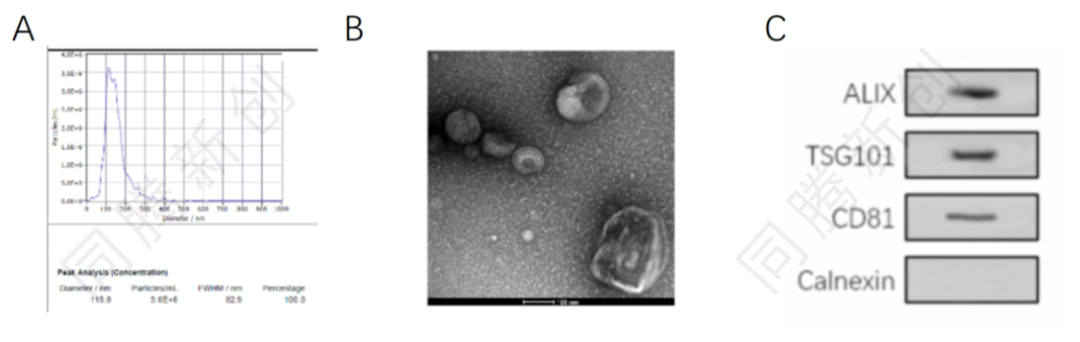 图10. Standard CD 培养基制备3D UC-MSC外泌体检测结果:A.NTA,B.TEM,C.WB