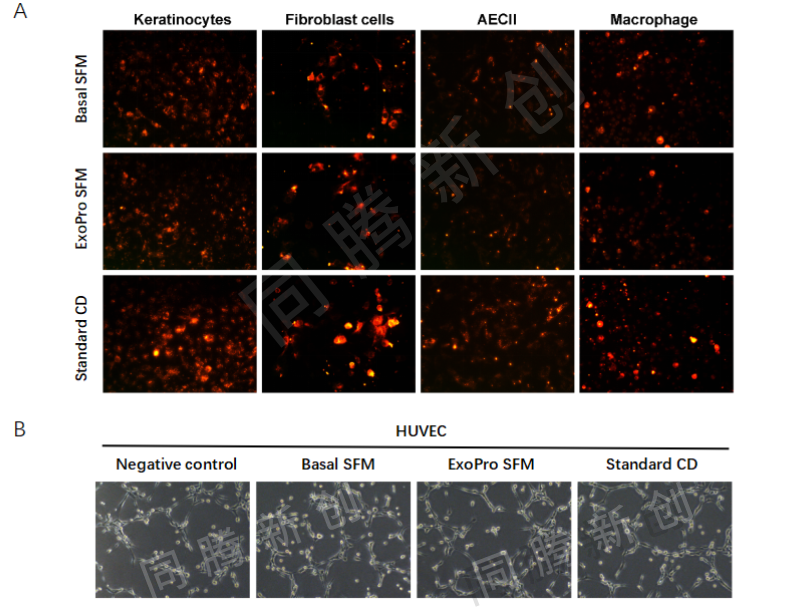 图11. Standard CD 培养基制备的3D UC-MSC外泌体能促进细胞内吞(A)和脐静脉内皮细胞成小管能力(B)